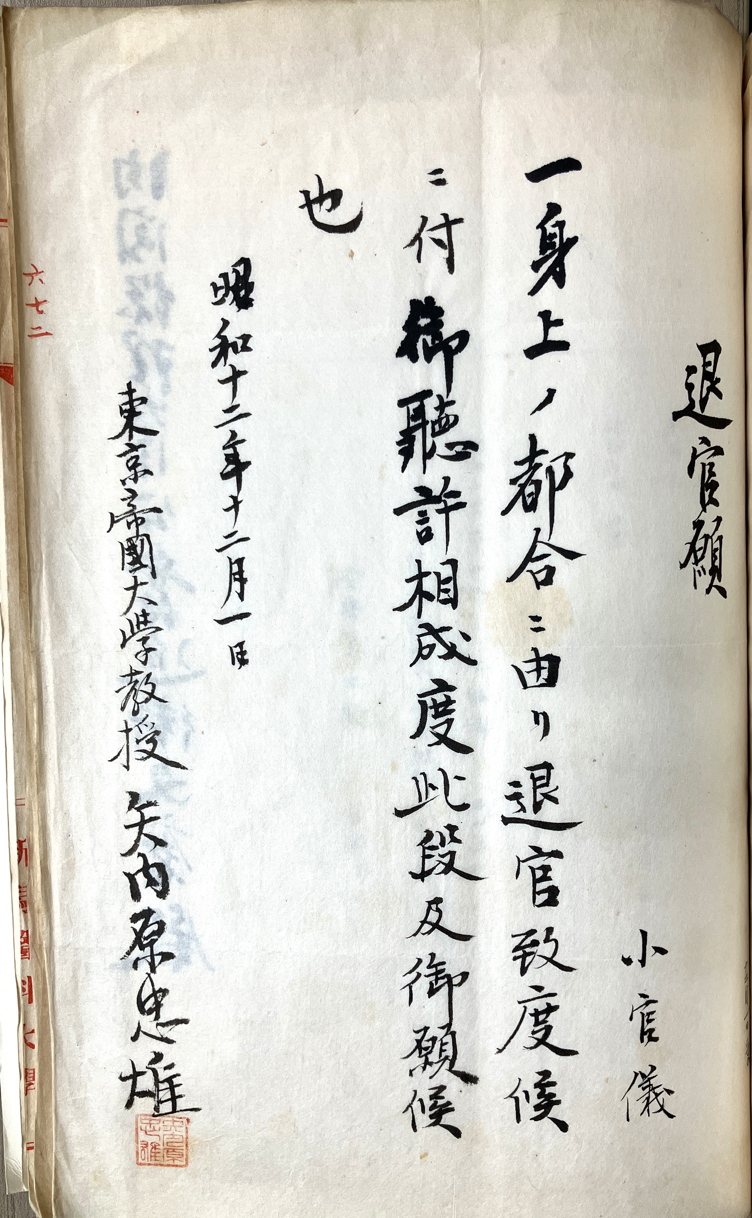 これは、教授・矢内原忠雄(経済学部)直筆の辞表です(S0018/SS01/0147)。矢内原は日中戦争下の1937年、政府や戦争への批判的言論が問題視されて東大を辞職させられました。興味深いのは、「職員進退」には、その際に矢内原に対して、文部大臣の承認のもと「職務勉励」として賞与が支払われた記録が残されている点です。賞与額2200円の算出根拠となる計算メモが綴じられ、そのうち上限支給額1600円を超過する600円については、「年末賞与」として別途支給する手続きをとった旨が記されています。当時、退職する教官等に賞与を支給するのは通例のことで、これもその慣行を踏襲したに過ぎないのでしょう。ただやはり、矢内原の追放という思想的事件と、賞与額を計算し、規則に基づいてそれを支給するという事務的な営みとの間には、大きな落差を感じます。しかしその奇妙な結合こそが、職業としての研究者という存在を成立させているのかもしれません。「職員進退」は、そうした世界の一端を示しているのです。