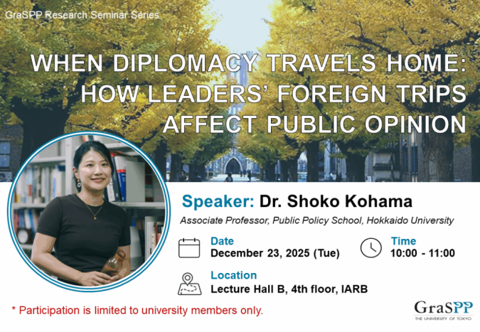| Contact | GraSPP Research Seminar Secretariat Graduate School of Public Policy The University of Tokyo graspp.pr.j[at]gs.mail.u-tokyo.ac.jp (please replace [at] with @) |