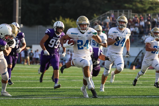 アメリカンフットボールは一つの試合を4つに分割し、それぞれ第1クオーター~第4クオーターと呼んでいます。基本的に一つのクオーター(Q)は15分です。東大は第1Qで先制タッチダウンを決めるも、その後立教大学に逆転され、7点を追う形で第4Qに突入しました。試合時間残り1分10秒で東大側のオフェンスとなったところでRB#24米田健人選手(工学部・4年)が77ヤードを独走し、起死回生のタッチダウン(※1)を決め、フィールドが熱狂の渦に呑まれました。DB#21舟本寛太朗選手(経済学部・4年)が落ち着いてキックを決め、同点に追いつきました(東大17-17立教)。この試合で米田選手は関東学生アメリカンフットボール連盟1部リーグTOP8第1節の全試合の中で最も活躍した選手に贈られるPLAYER OF THE WEEKに選出されました。