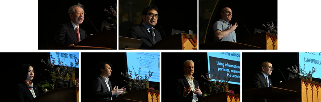 基調講演では、AIと物理を牽引する国内外7名のトップランナーが登壇しました。甘利俊一氏(帝京大学 特任教授)による「AIの歴史と現状: 来るべき文明社会」を皮切りに、岡野原大輔氏(株式会社Preferred Networks 代表取締役社長)が「物理のためのAI、AIのための物理」を、画像生成AI(拡散モデル)発明者であるJascha Sohl-Dickstein氏(Anthropic テクニカルスタッフ)が「Diffusion models and other surprising progress」を講演しました。さらに、宇都宮聖子氏(OpenAI, Japan ソリューションエンジニア)による「知が社会になるとき―不確実性の科学と生成AI」、松尾豊氏(東京大学 教授)による「進化する人工知能とAIスタートアップ」、VAE発明者であるMax Welling氏(アムステルダム大学 教授)による「The Confluence of Generative AI and Physics」、そして大栗博司氏(カリフォルニア工科大学 教授)による「AIは自然界の基本法則を発見できるか」と、最先端の知見が次々と提示されました。