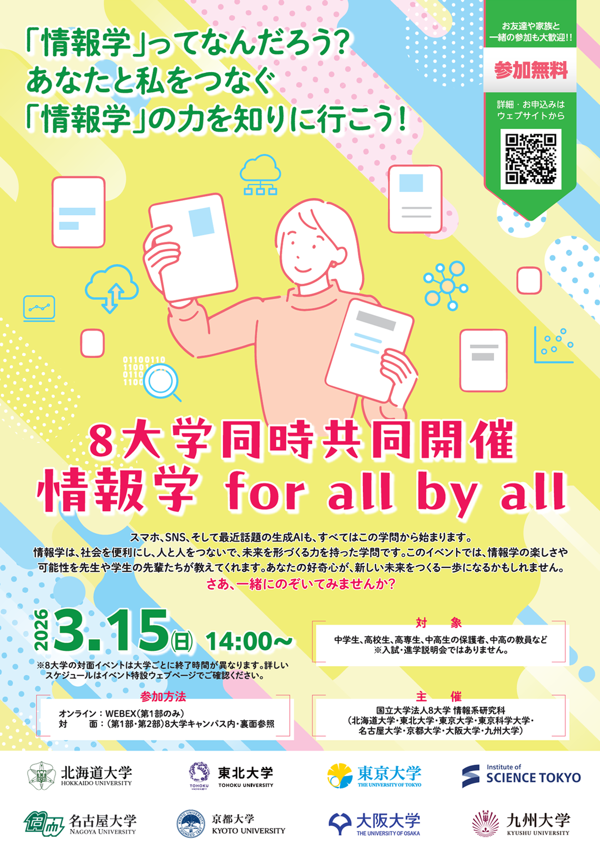 国立大学法人8大学(北海道大学・東北大学・東京大学・東京科学大学・名古屋大学・京都大学・大阪大学・九州大学)の情報系研究科が連携し、2026年3月15日(日)、「『情報学』ってなんだろう?あなたと私をつなぐ『情報学』の力を知りに行こう!8大学同時共同開催 情報学 for all by all」を開催します。