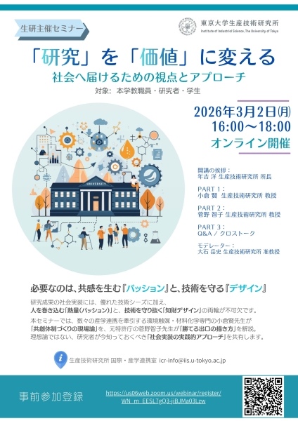 生産技術研究所では、本学所属の教職員・学生の皆様を対象に、「研究」を「価値」に変える:社会へ届けるための視点とアプローチ セミナーを以下の通り開催いたします。
