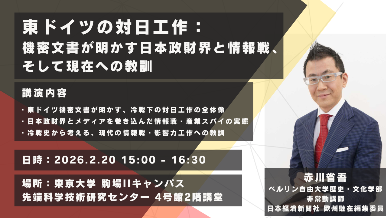 東京大学先端科学技術研究センター(RCAST)経済安全保障インテリジェンス分野(ESIL)は、ベルリン自由大学歴史・文化学部非常勤講師、日本経済新聞社欧州駐在編集委員の赤川省吾氏を招へいし、以下の公開セミナーを開催いたします。