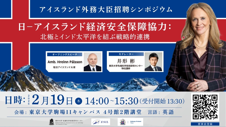 東京大学先端科学技術研究センター(RCAST)経済安全保障インテリジェンス分野(ESIL)は、駐日アイスランド大使館と共催で、以下の公開シンポジウムを開催いたします。