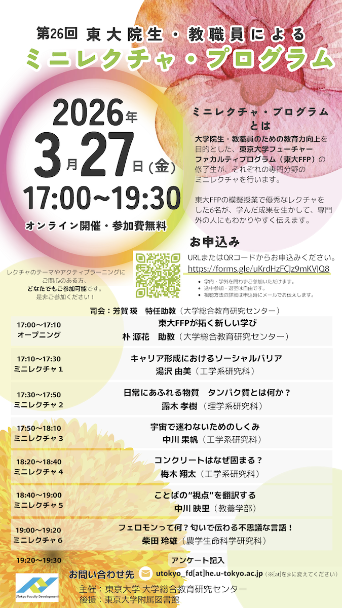 | 17:00-17:10 | オープニング | 朴 源花 助教(大学総合教育研究センター) 「東大院生・教職員によるミニレクチャプログラム」の意義、そもそも東大FFPとは何か?など、企画の趣旨を語ります。 |