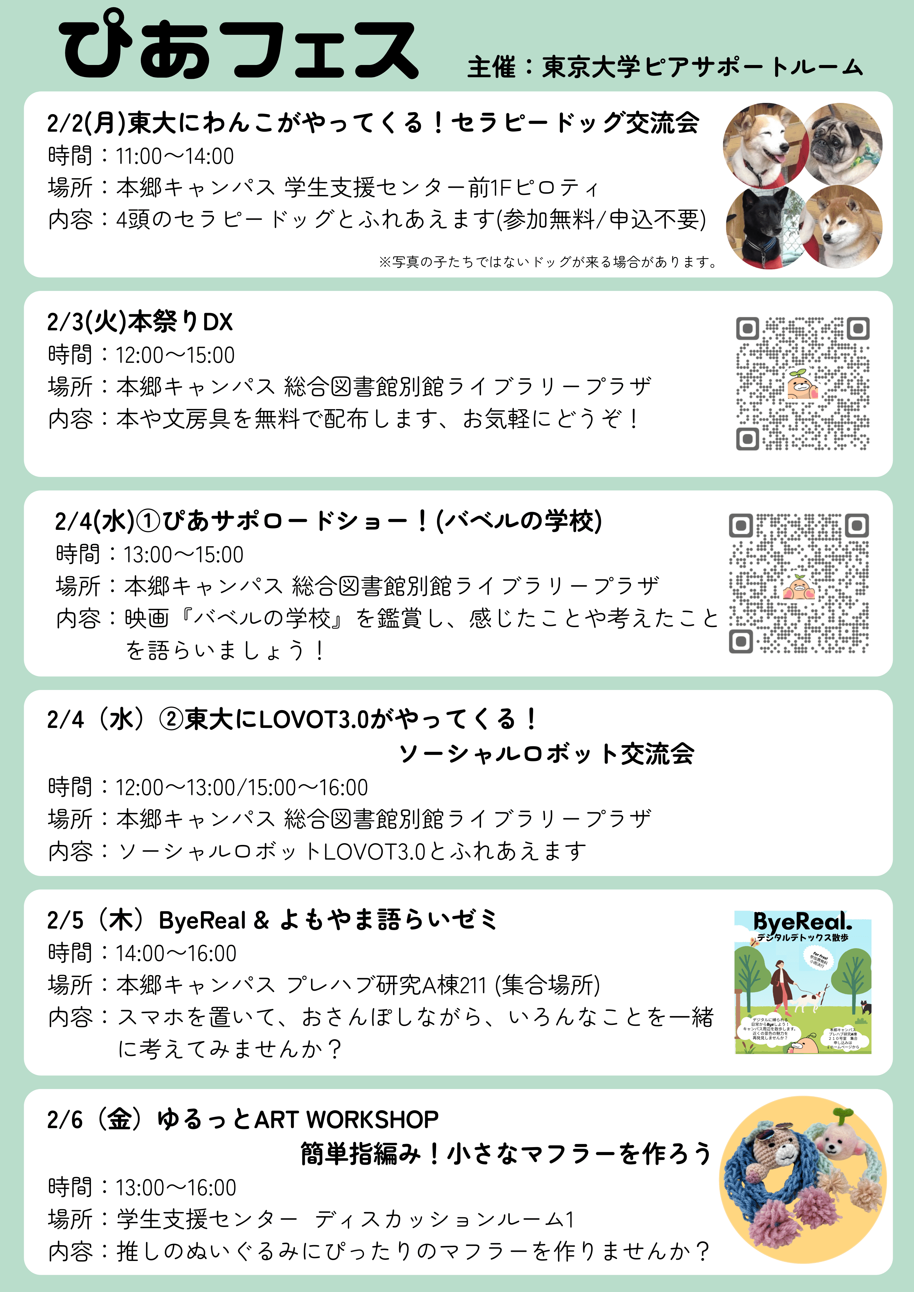 (一部要事前申込) HPの各参加リンクフォームからお申込みください https://ut-psr.net/2026/01/16/02-06peer-festival/ |