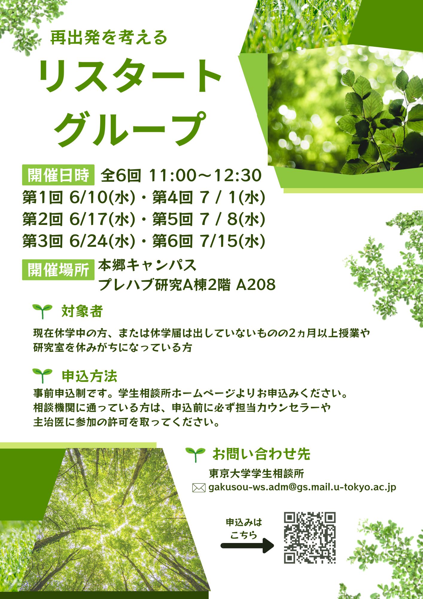 リスタートグループは、そのような学生を対象に、リスタート(再出発)のための準備をお手伝いするグループです。