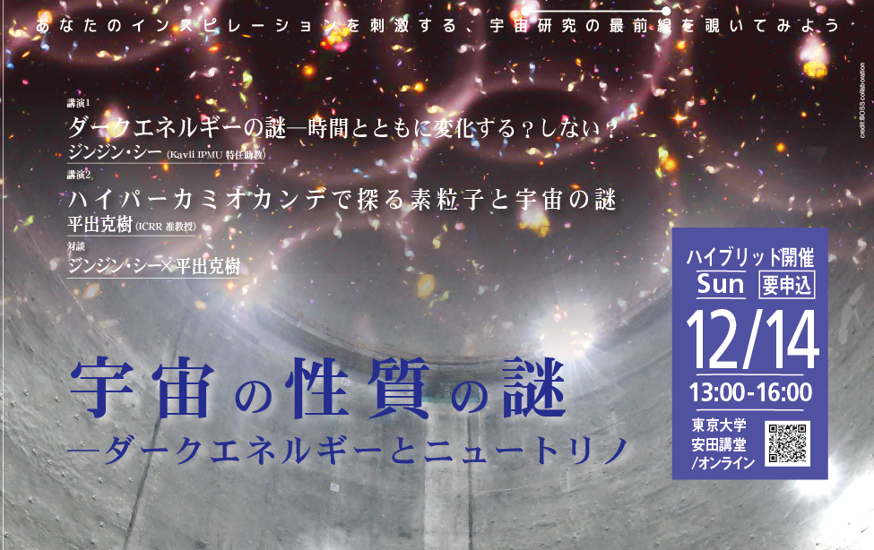 2025年12月14日(日)、第33回目となる東京大学国際高等研究所カブリ数物連携宇宙研究機構 (Kavli IPMU)と東京大学宇宙線研究所 (ICRR) による合同一般講演会「宇宙の性質の謎─ダークエネルギーとニュートリノ」をハイブリッド開催いたします。