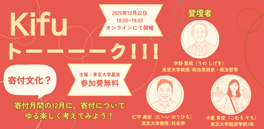 シリーズ「Kifuトーーーーク!!」は、東京大学基金が主催する、寄付について”ゆるく・楽しく・率直に”語るオンラインイベントです。