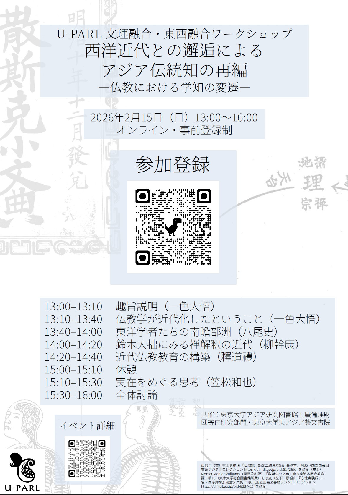 本ワークショップは、東京大学アジア研究図書館上廣倫理財団寄付研究部門(U-PARL)第三期事業「文理融合・東西融合の研究:Society5.0における人の生き方」の一環として開催される。今年度テーマ「Society5.0における人のつながり」のもと、アジアをつなぐ伝統知の一つであった仏教を対象とし、その解釈学的体系たる「近代仏教学」がいかなる再編によって生まれたかを多角的に検討する。まずU-PARLより一色大悟が、前年度における仏教天文学書デジタル化事業成果をもとに、近世日本のインド仏教学において自然科学との邂逅がもたらした知識のあり方の変化を論じ、本ワークショップの総論とする。ついで各論として八尾史・柳幹康・釈道礼が、仏教学者の視点から、それぞれの専門における仏教学の近代化の意味について報告する。最後に、この仏教学における変容を、笠松和也が世界哲学の文脈に位置づける。