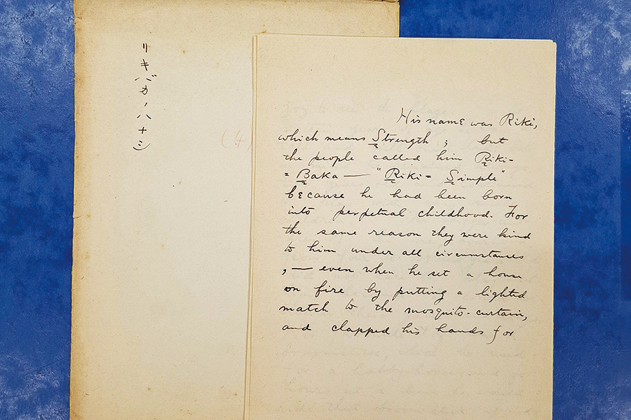 口承されてきた日本の民話や神話を英語で西洋社会に紹介した功績で知られるハーン。研究室には彼の草稿や蔵書などの資料が100点以上残ります。「耳なし芳一」や「雪女」とともに『怪談』に収められた短編「力ばか」の草稿は、その仕事ぶりをよく伝えます。