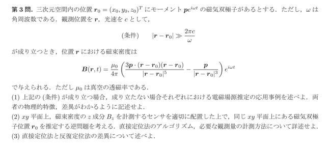 当初、上記問題の(条件)で記載された不等号の向きに対応した磁束密度B(r,t)を記載した問題を作成した。しかし、難易度が高くなりすぎると判断されたため、現在記載されている磁束密度B(r,t)に変更した。これに伴い(条件)の不等号の向きを変えるべきところであったところを、修正が施されなかった。