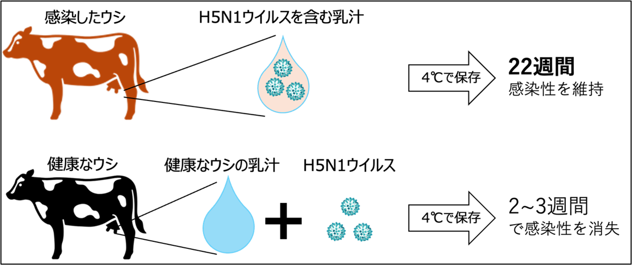 - ウシ由来H5N1高病原性鳥インフルエンザウイルスに感染したウシの乳汁中ではH5N1ウイルスが4°C保存下では22週間以上感染性を有する。